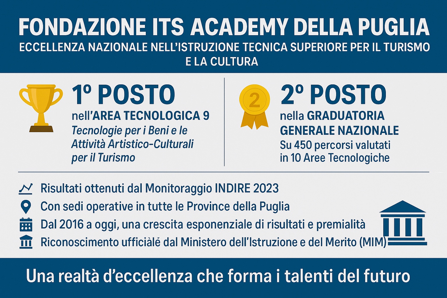 La nostra Fondazione è al 1° Posto nel Ranking nazionale dell’Area Tecnologica 9 [Tecnologie per i Beni e le Attività Artistiche e Culturali per il Turismo”] e al 2° posto assoluto nella Graduatoria generale relativa a tutte le dieci aree tecnologiche, su 450 percorsi presi in esame nel monitoraggio INDIRE MIM 2025.
