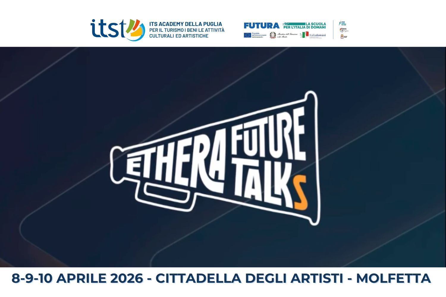 L’ITS Academy Turismo. Arte e Cultura della Puglia parteciperà alla seconda edizione di Ethera Future Talk, l’evento culturale e formativo che dall’8 al 10 aprile porterà all’Auditorium della Cittadella degli Artisti studenti e giovani da tutta la regione, con l’obiettivo di supportarli nelle scelte per il proprio futuro accademico e professionale.