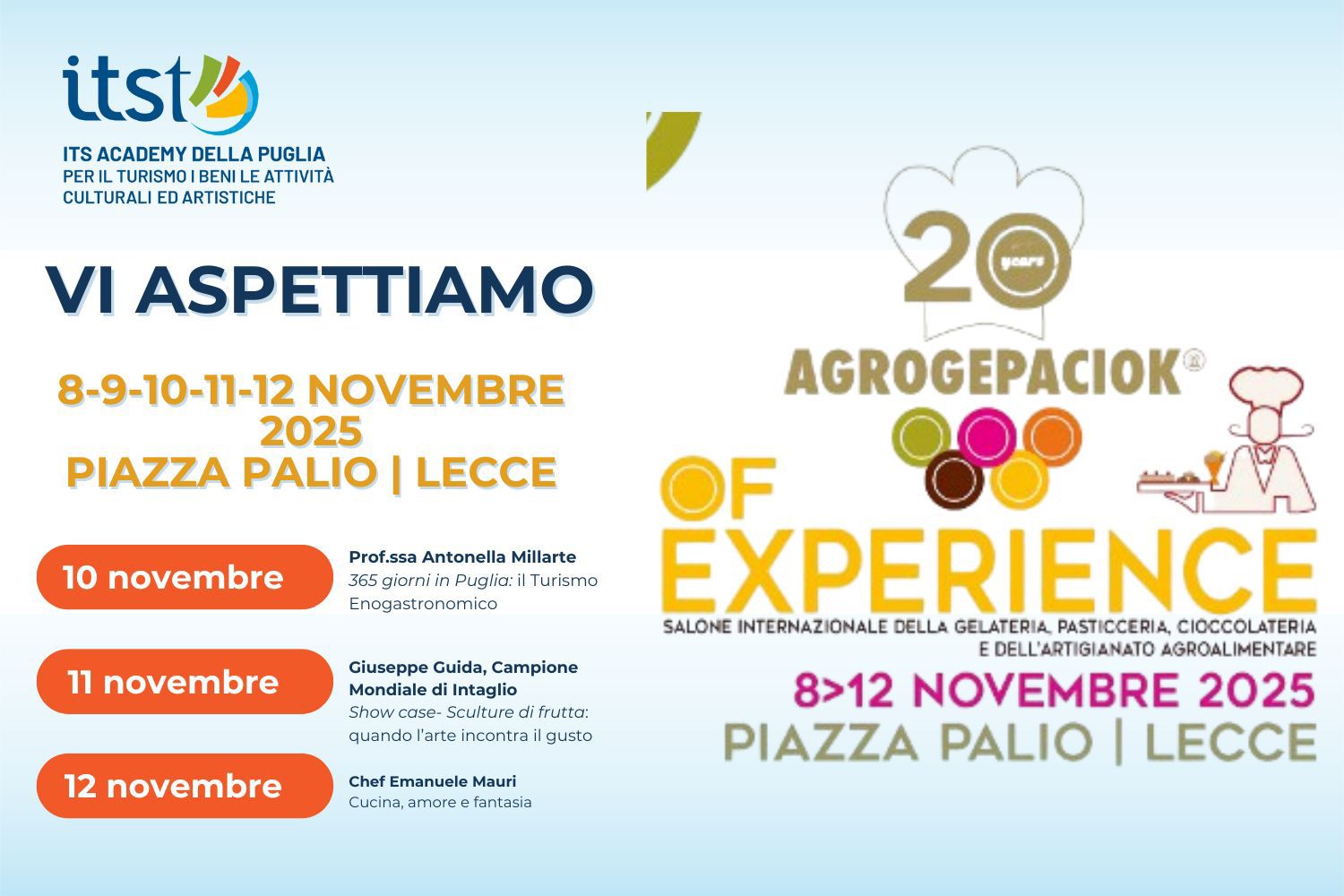 Per la prima volta il nostro ITS Academy della Puglia per il Turismo, i Beni e le Attività Culturali ed Artistiche sarà presente ad Agrogepaciok, il Salone Internazionale della Gelateria, Pasticceria, Cioccolateria e dell’Agroalimentare di Qualità, giunto alla sua 20ª edizione.